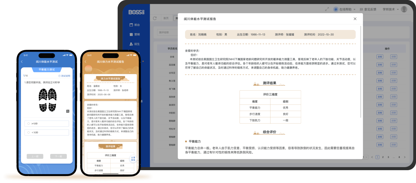 通过专业体能、脑力、心理评估,生成专属评估报告,根据报告定制专属个性化康养方案